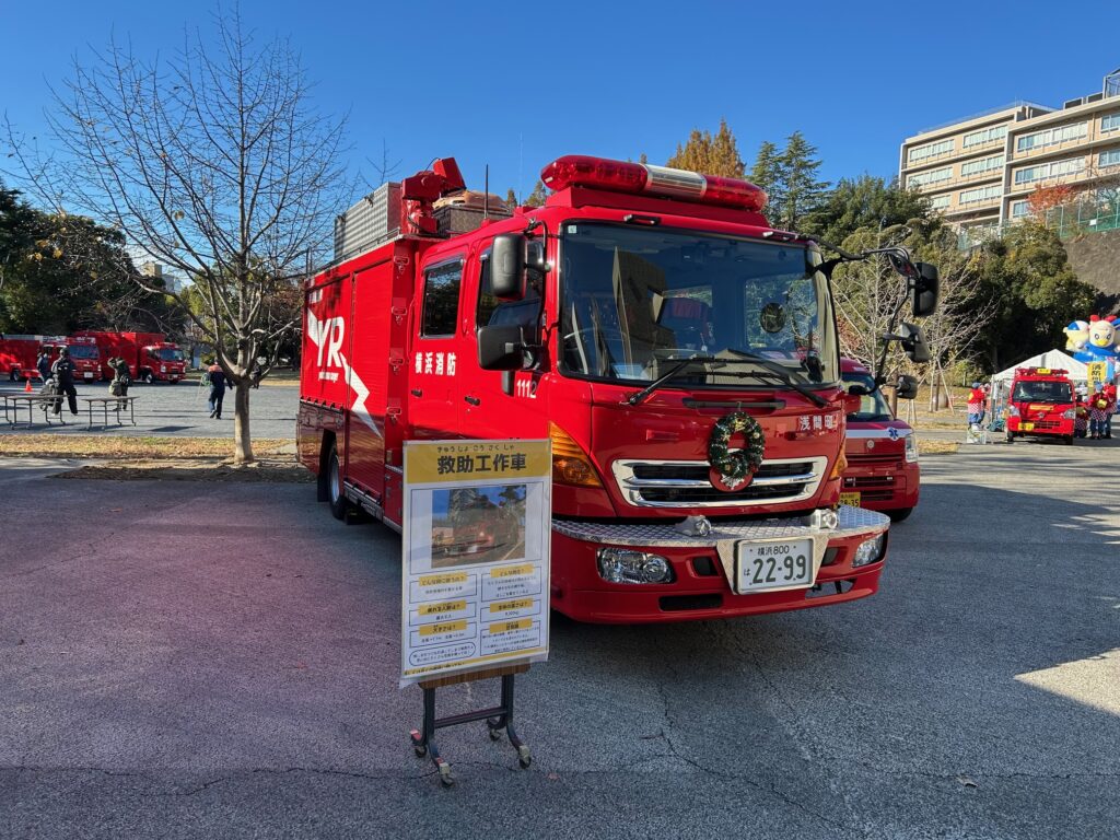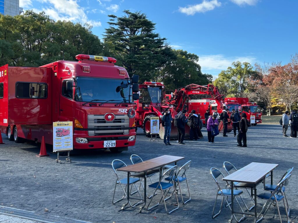 当日は天候にも恵まれ、多くの子供連れの親子をはじめとした一般の方たちがイベントにご参加いただきました。珍しい消防車もたくさん展示されていました。